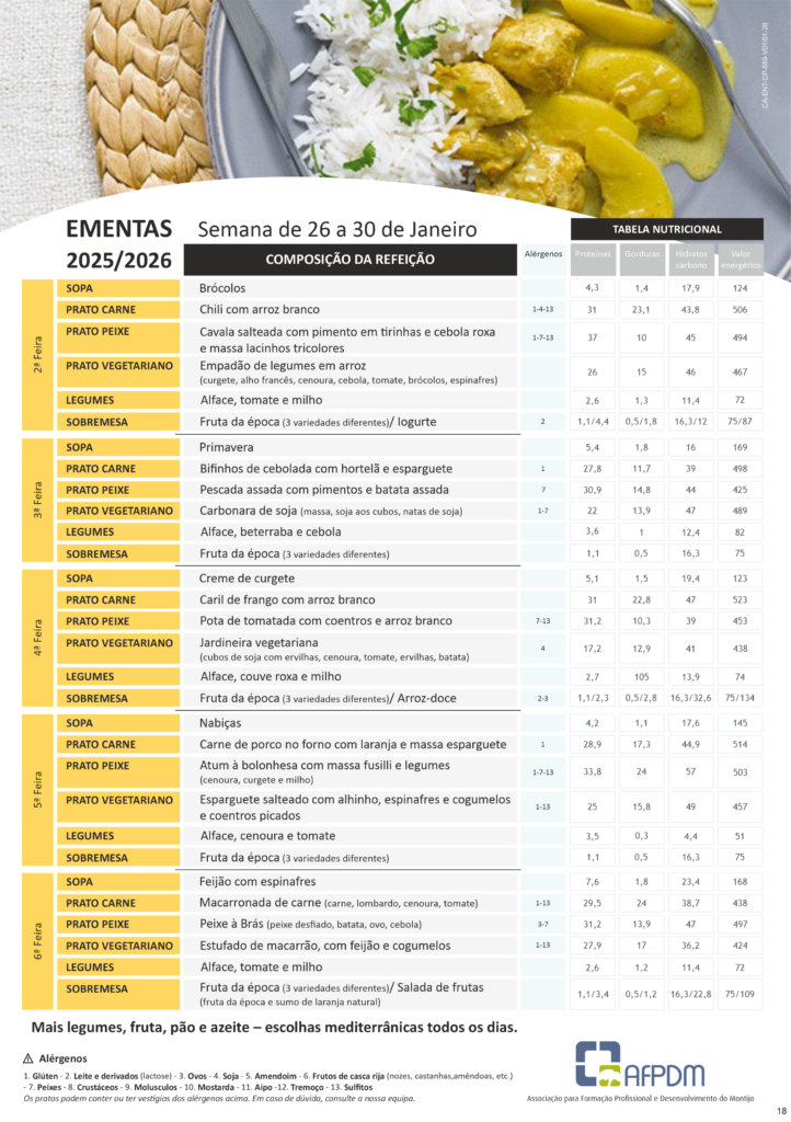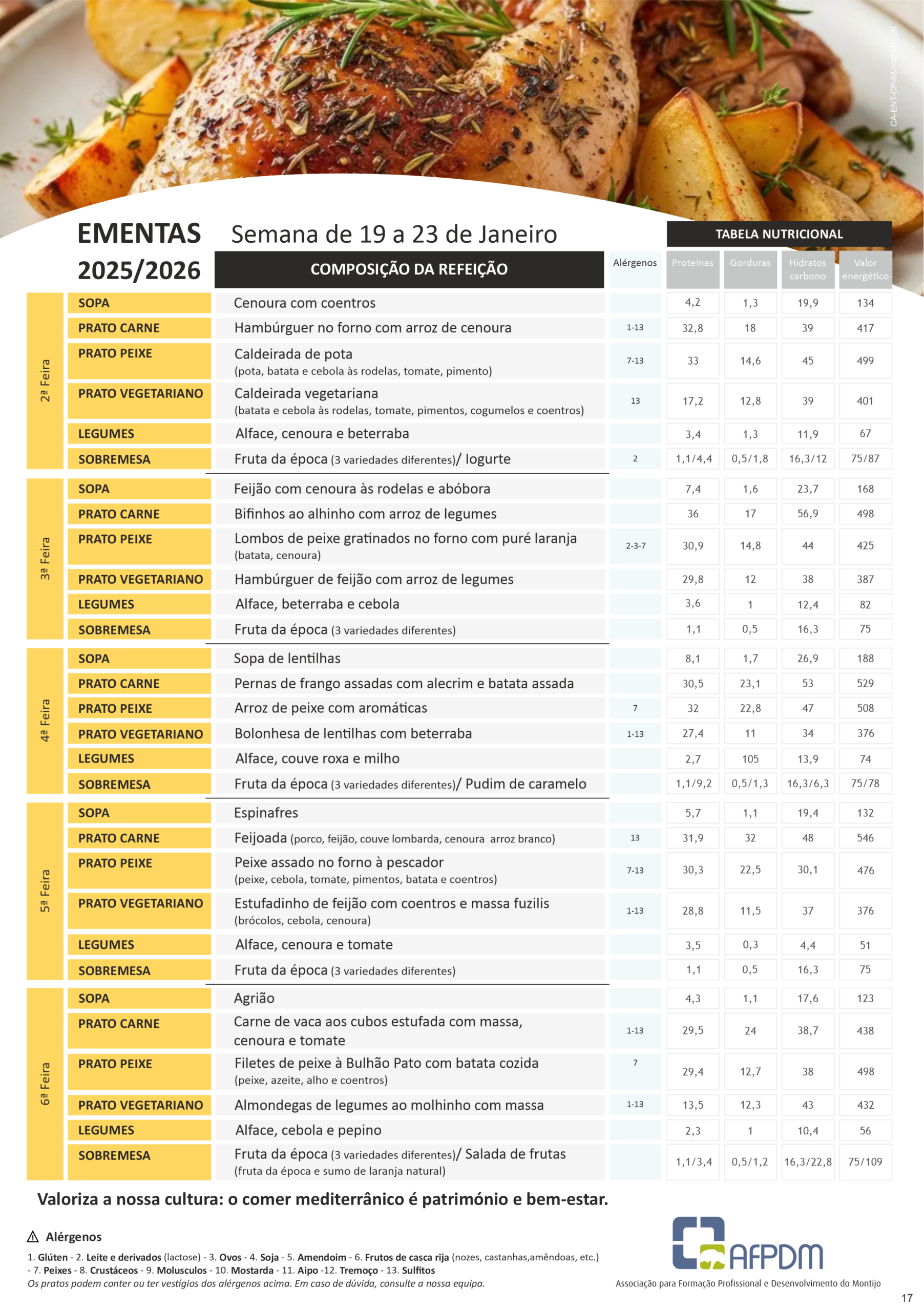 Ementas 26 a 30 de Janeiro de 2025 19 a 23 de Janeiro de 2026 Telefone 21 231 38 62 (Cham. p/rede fixa nacional) Morada Rua José de Almada Negreiros, nº217 Afonsoeiro2870-442 Montijo Email [email protected]
